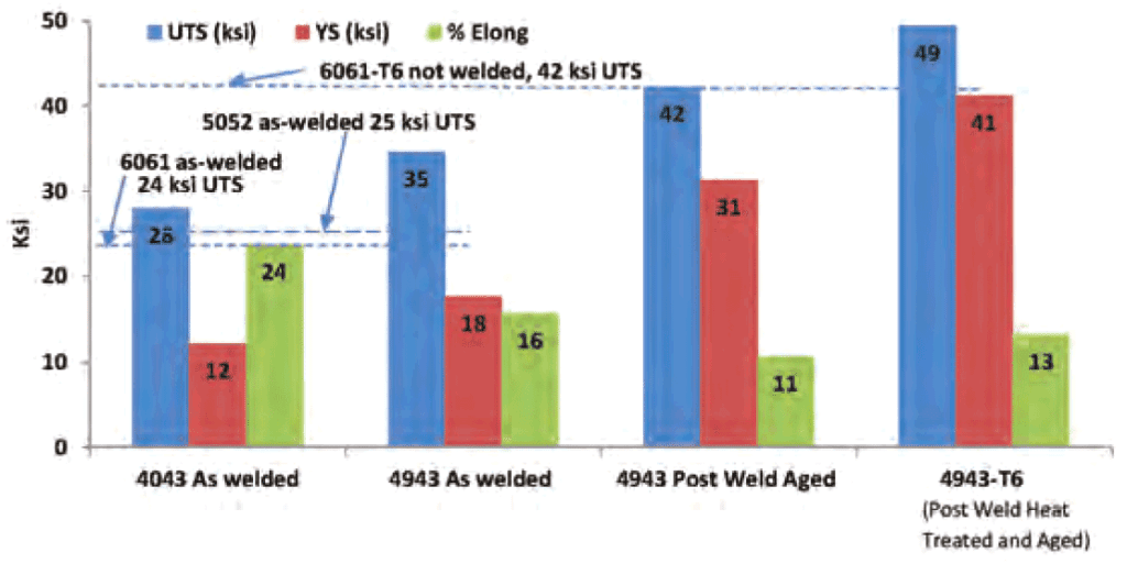 Testing has shown that 4943 will typically provide 25% improved tensile and shear strength as 50% improved yield strength over 4043 in the as-needed condition.