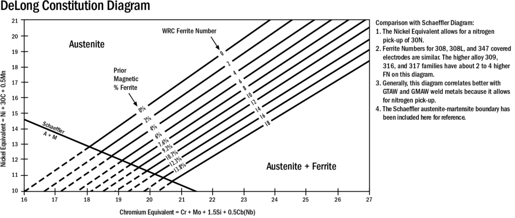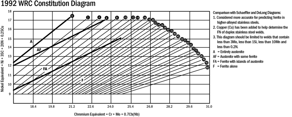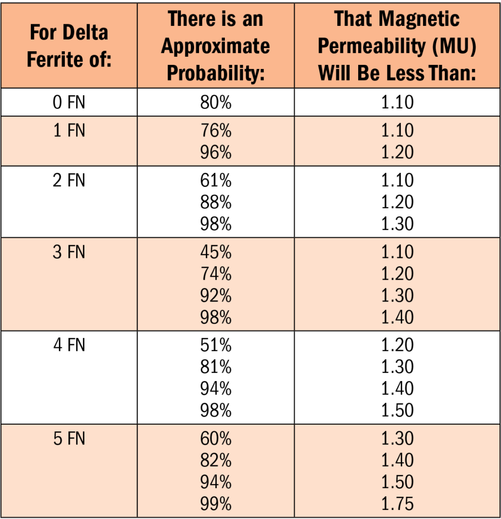 Although a direct relationship between ferrite and permeability is evasive, Figure 27 (adapted from data published by Ebasco Services) provides an educated guess of what magnetic permeability to expect with ferrite levels of 0 to 5 FN.
